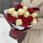 Роза красная – 8 шт. Роза белая – 7 шт. Оформление – 1 шт.