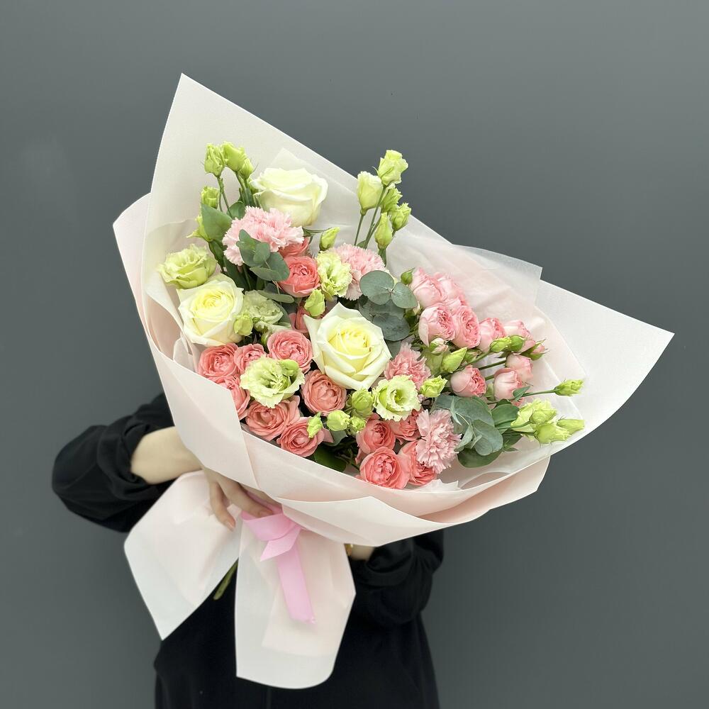 Альстромерии, Кустовые розы, Лизиантусы, Пионовидные розы, Розы, Ромашки