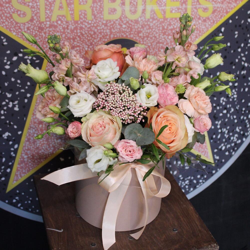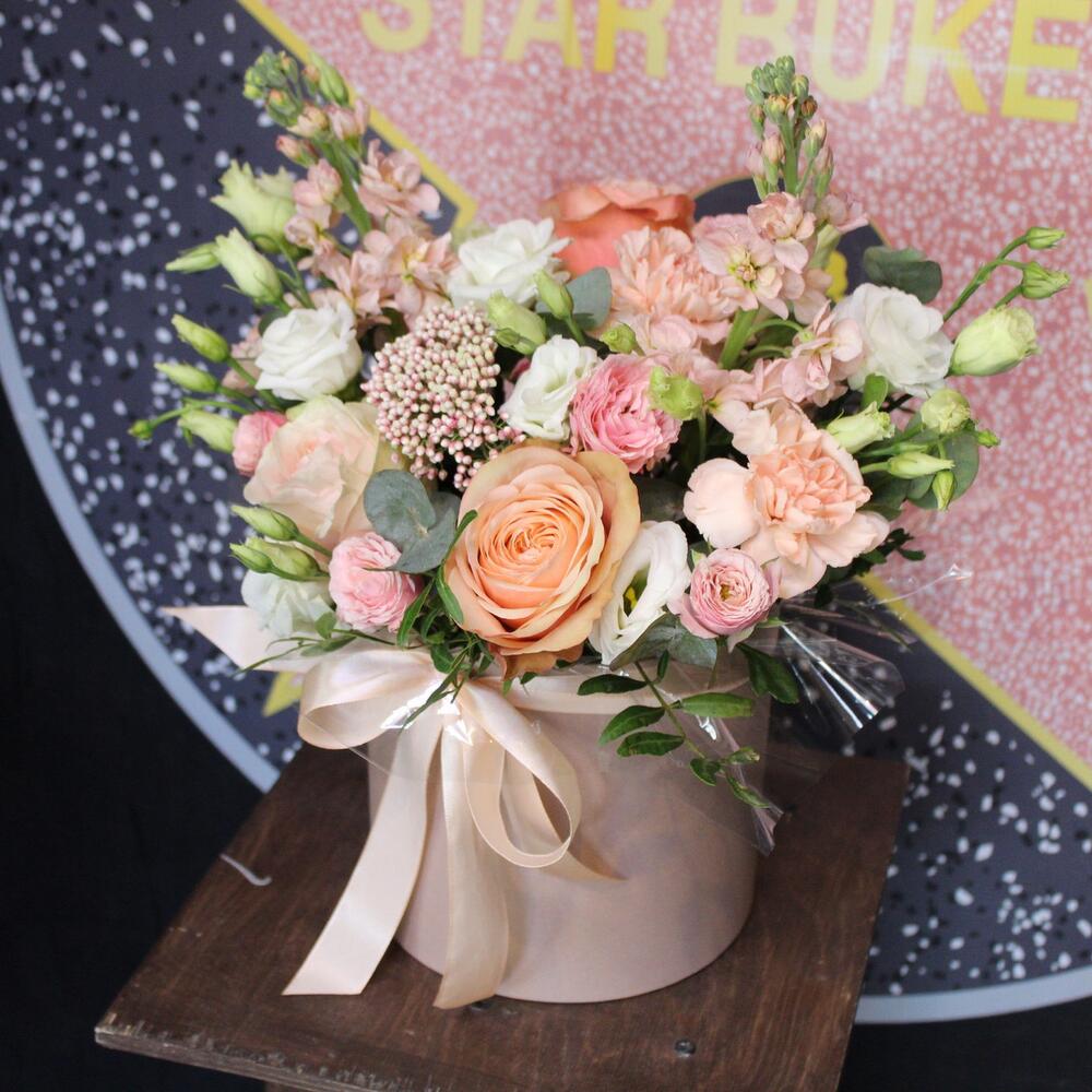 Маттиола априкот – 2 шт.Эустома – 1 шт.Роза пионовидная кахала – 2 шт.роза фрутетто – 1 шт.Роза кустовая пионовидная мадам бомбастик – 1 шт.Озотамнус – 1 шт.Диантус – 3 шт.Фисташка – 1 шт.Эвкалипт – 1 шт.Пленка прозрачная – 1 шт.Лента атласная – 1 шт.Оазис флористический – 1 шт.Шляпная коробка – 1 шт.