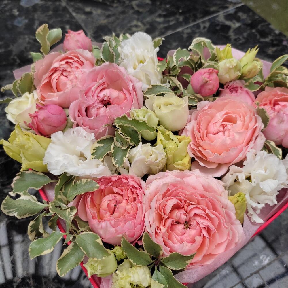 Роза кустовая пионовидная – 2 шт.Питтоспорум – 2 шт.Лизиантус – 3 шт.Коробка сердце – 1 шт.
