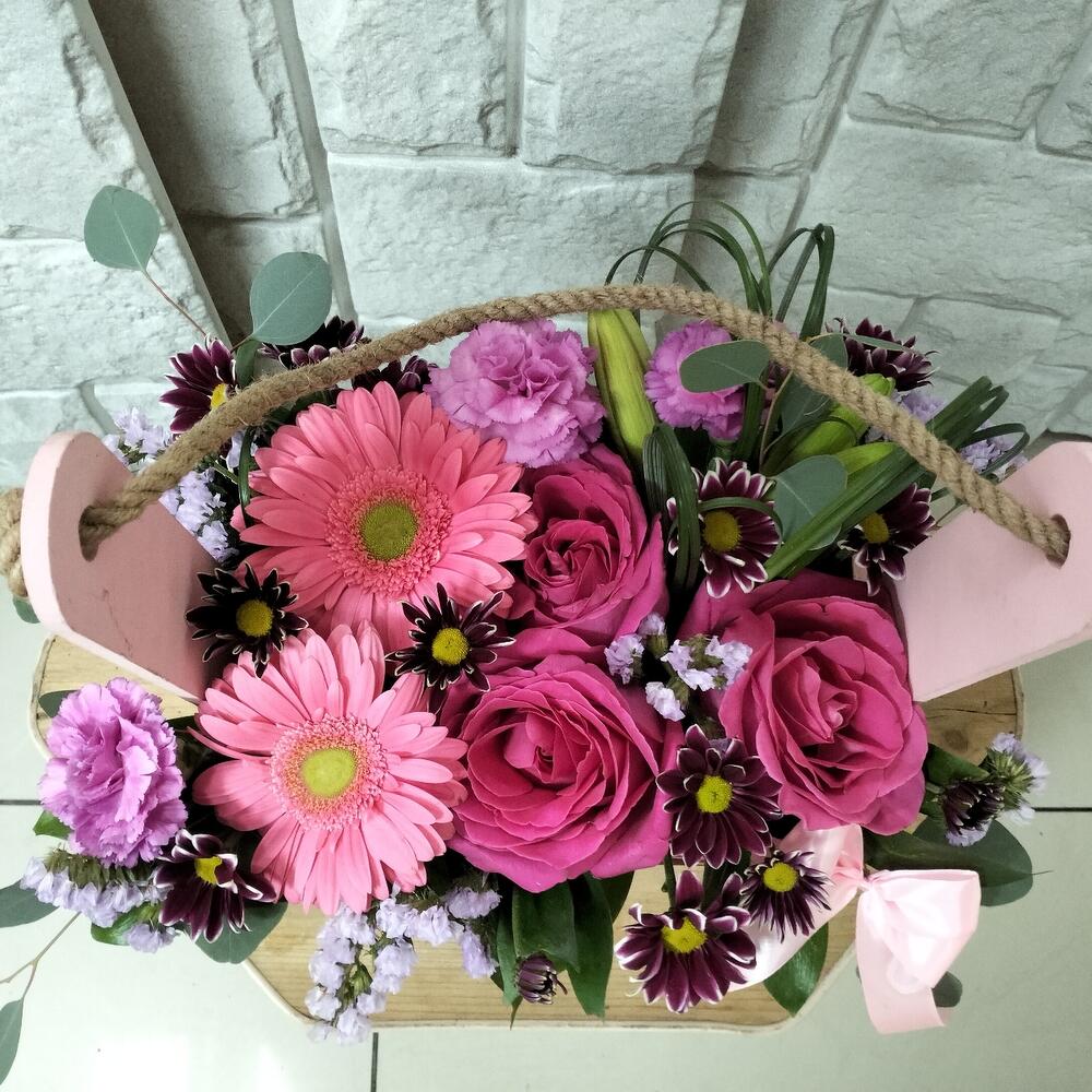 Хризантема кустовая – 2 шт.Роза Эквадор – 3 шт.Лента атласная – 1 шт.Гербера – 2 шт.Лилия белая – 1 шт.Гвоздика сортовая – 3 шт.Ящик деревянный – 1 шт.Эвкалипт Микс – 2 шт.Оазис флористический – 1 шт.Статица сиреневая – 1 шт.