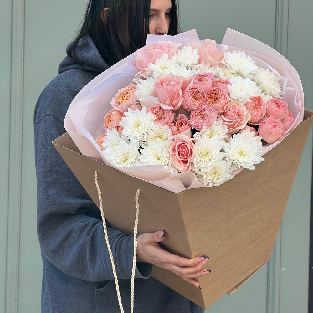 Альстромерии, Гвоздики, Кустовые розы, Лизиантусы, Розы, Хризантемы