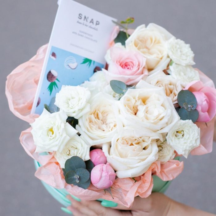 Нежная ароматная шояпная коробка с цветами и шоколадом