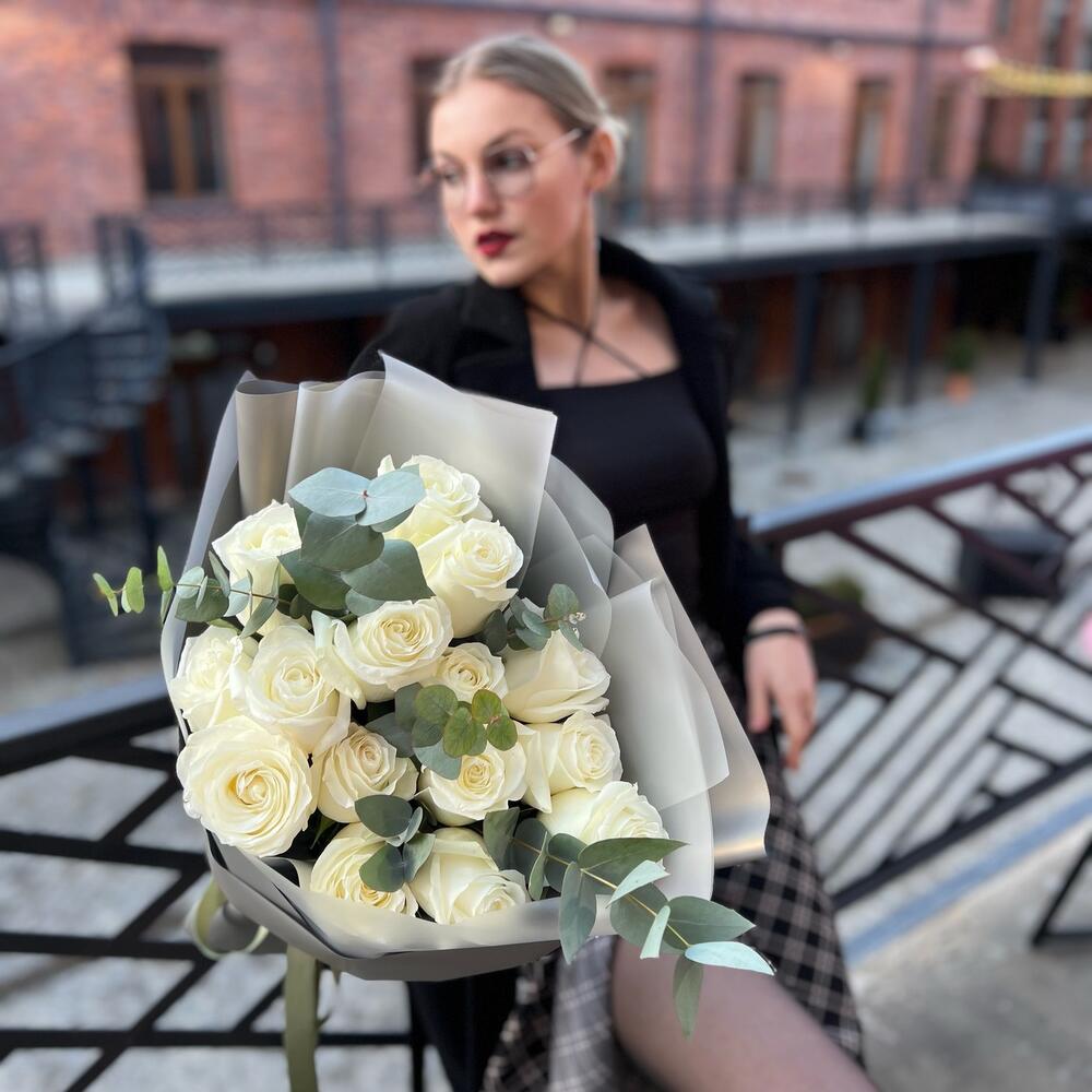 Эйфория (15 белых роз и эвкалипт)