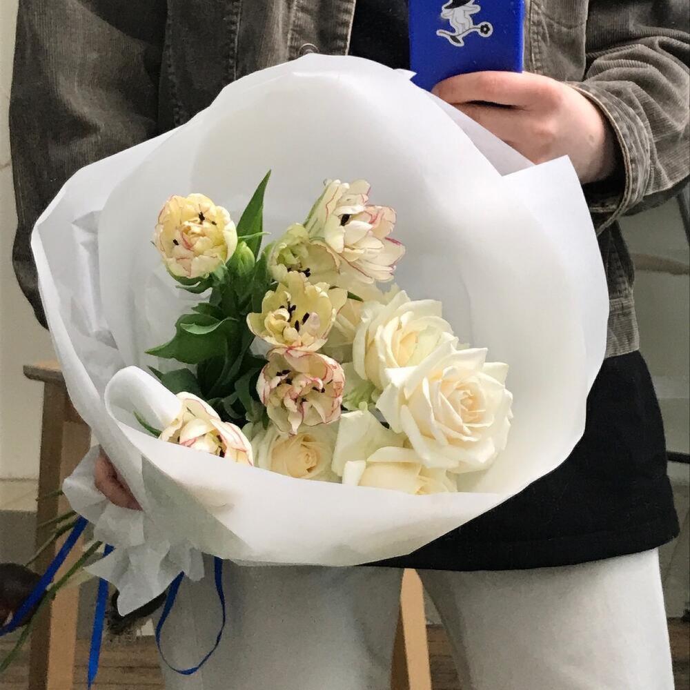 роза молочного оттенка – 5 шт.тюльпан кустовой фермерский – 3 шт.