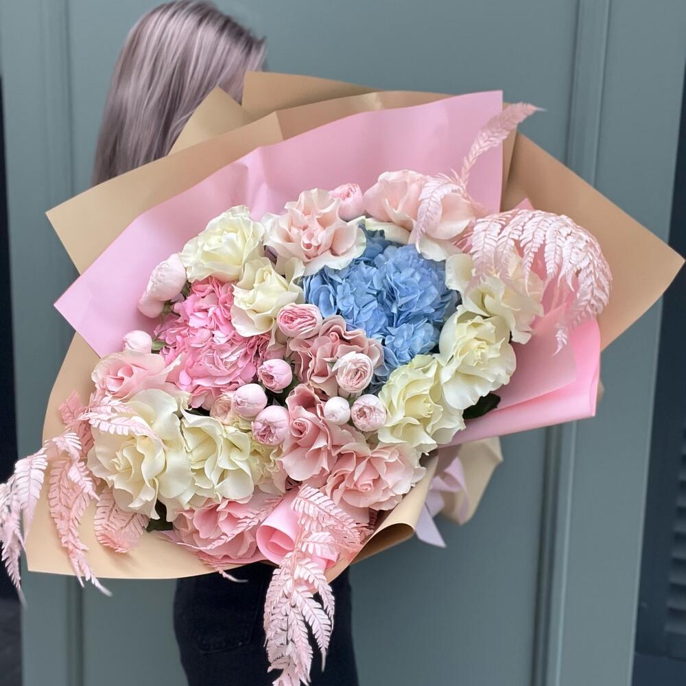 Альстромерии, Гортензии, Кустовые розы, Лизиантусы, Розы, Хризантемы