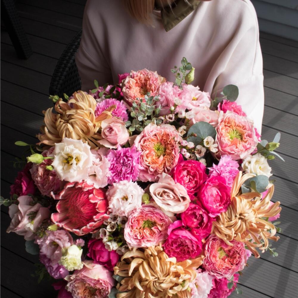 Альстромерии, Гвоздики, Кустовые розы, Лизиантусы, Розы, Хризантемы