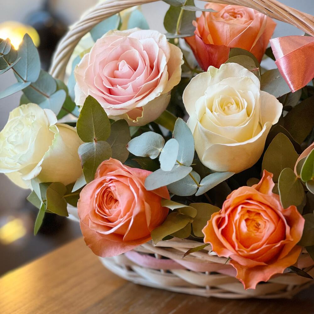 Корзина с цветами нежные розы с эвкалиптом на день рождения маме, сестре, подруге