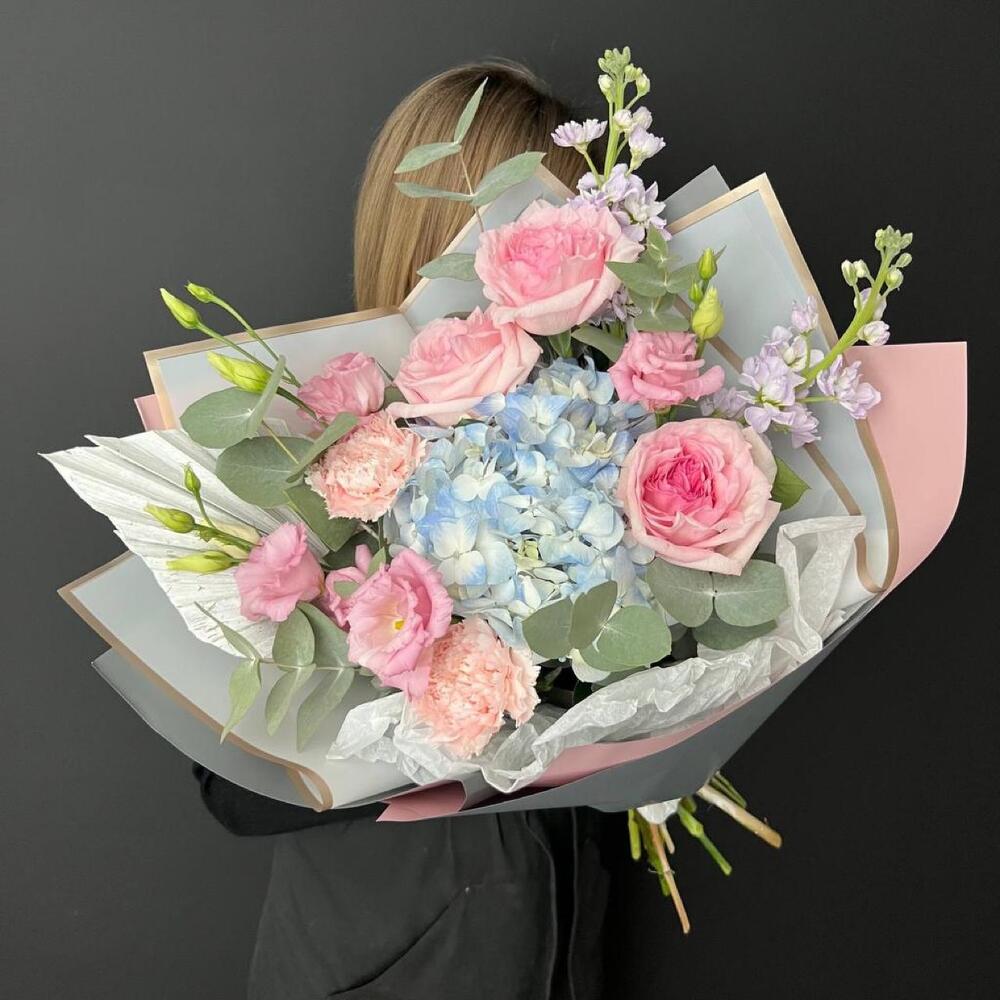 Гортензия – 1 шт.Лизиантус – 2 шт.Маттиола – 2 шт.Эвкалипт – 2 шт.Диантус – 2 шт.Роза пионовидная – 3 шт.Упаковка дизайнерская – 3 шт.Лист пальмы – 1 шт.
