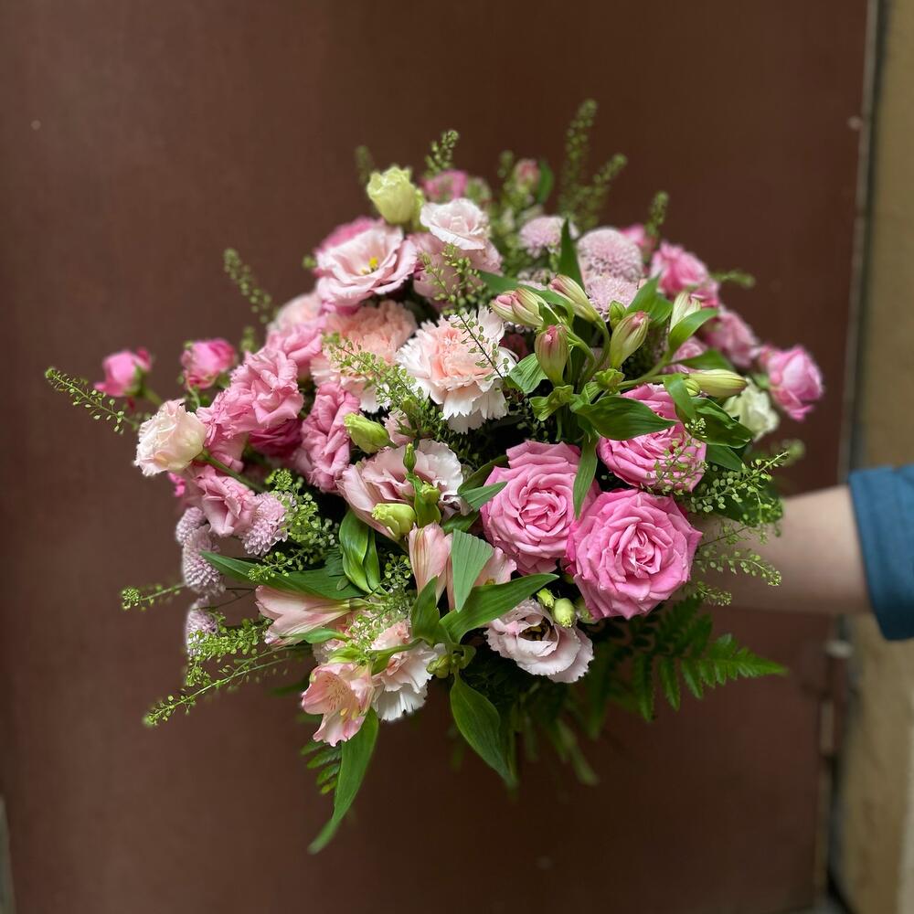 Лизиантус – 3 шт.Папоротник – 3 шт.Альстромерия – 3 шт.Гвоздика – 5 шт.Хризантема Сантини – 2 шт.Роза кустовая леди бомбастик – 4 шт.Фисташка – 4 шт.Гринбелл – 2 шт.