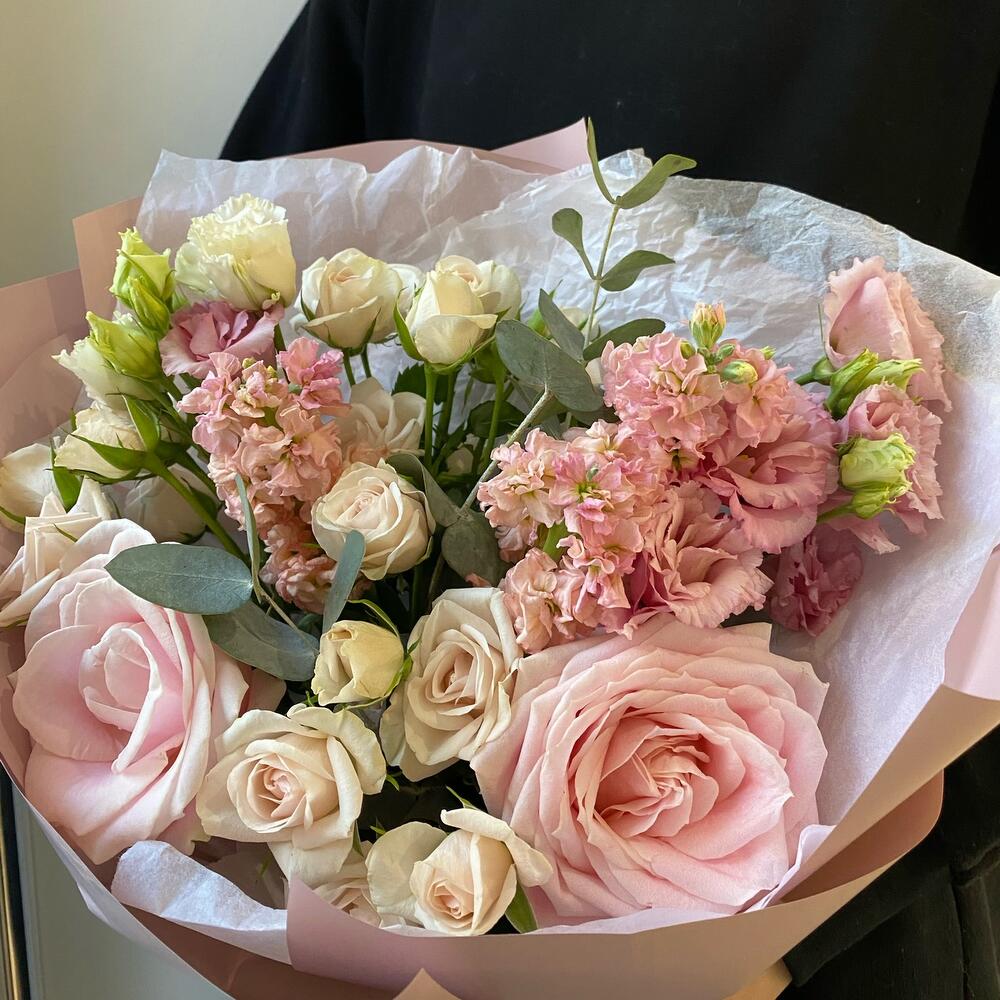 Роза одноголовая – 2 шт.эустома махровая розовая – 1 шт.Эвкалипт – 2 шт.Роза кустовая – 4 шт.Маттиола – 3 шт.Упаковка дизайнерская – 5 шт.Тишью белое – 2 шт.