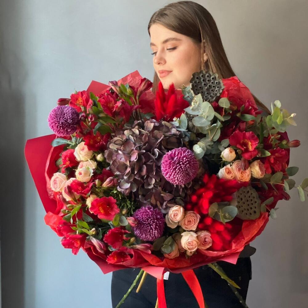 Категорий: Альстромерии, Гортензии, Кустовые розы, Розы, Сухоцвет, Хризантемы