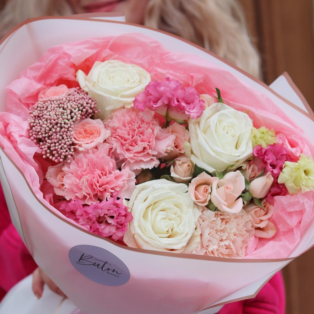 Роза белая пионовидная – 3 шт.Диантус сортовой – 3 шт.Озотамнус – 1 шт.Лизиантус розовый – 1 шт.Роза кустовая – 3 шт.Упаковка дизайнерская – 1 шт.