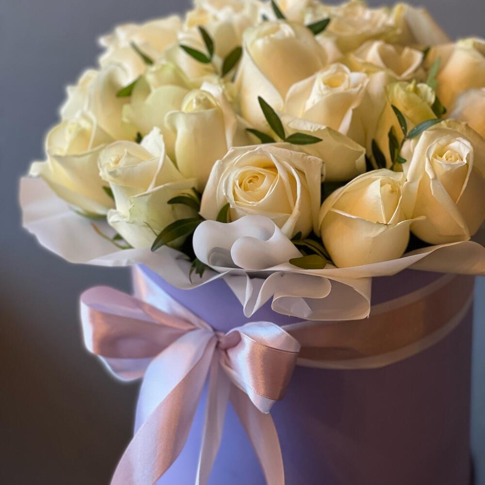 розы белые – 25 шт.Оазис флористический – 2 шт.Шляпная коробка – 1 шт.Пленка матовая – 1 шт.Лента атласная – 2 шт.работа флориста – 1 шт.