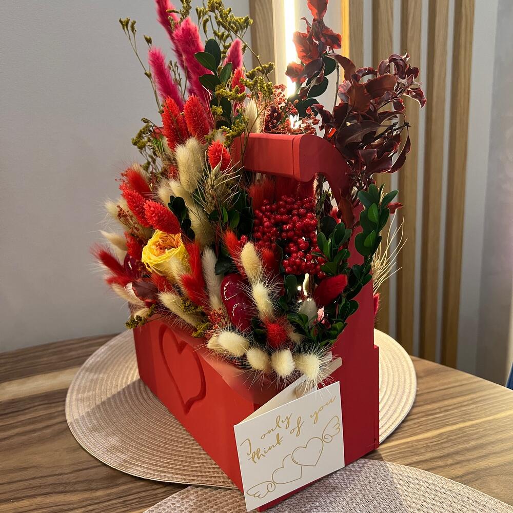 Яркая сочная композиция в ящикеВыполнена из сухоцветов , стабилизированных цветов.В составе есть 3 вставки в виде сердца Отличный подарок с любовью ❤️Необычный , не банальный , яркий сочный и не увядающий букет !)1-1,5 года будет радовать вас своими красками !)Композиция в красивый прозрачный упаковке , к каждой композиции в дополнение открытка , где можно написать пожелание , открытку можно выбрать при покупке написав в чат Сухоцветы и стабилизированные цветы – лучшая инвестиция в букет ,который не завянет!)