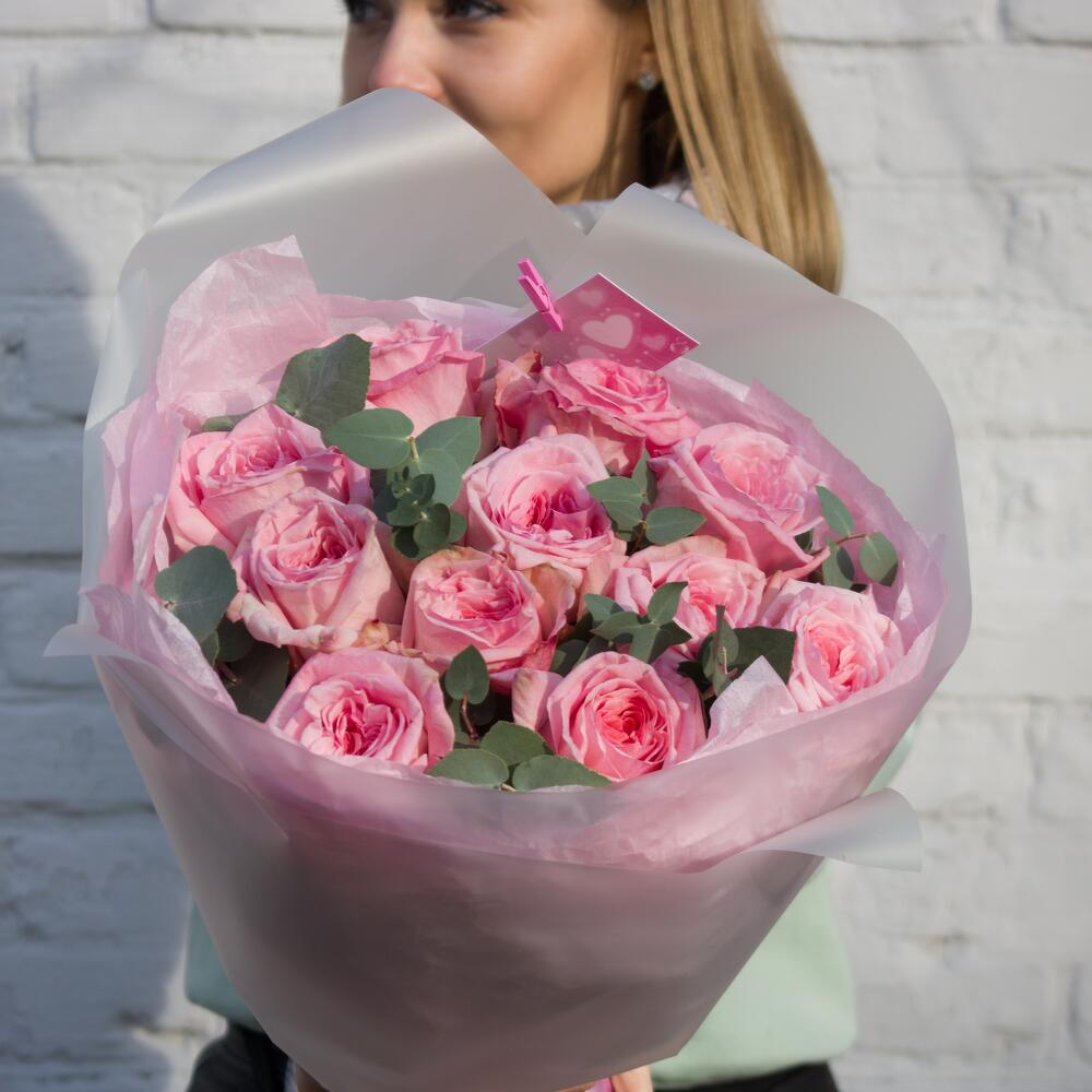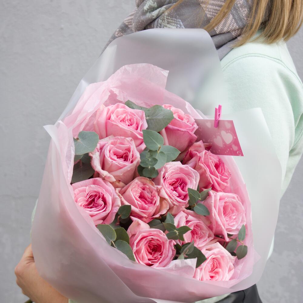 Пионовидная роза – 11 шт. Эвкалипт цинерария – 2 шт.