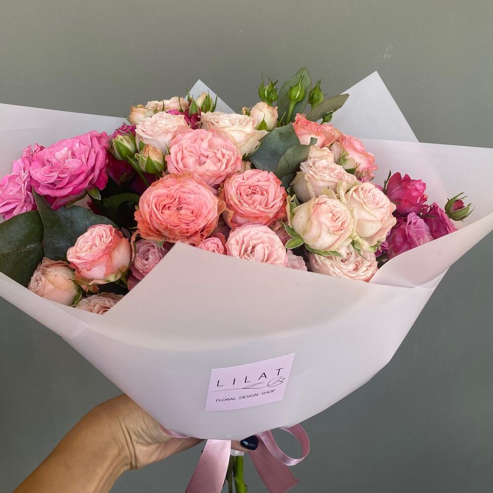 Альстромерии, Кустовые розы, Лизиантусы, Пионовидные розы, Розы, Ромашки