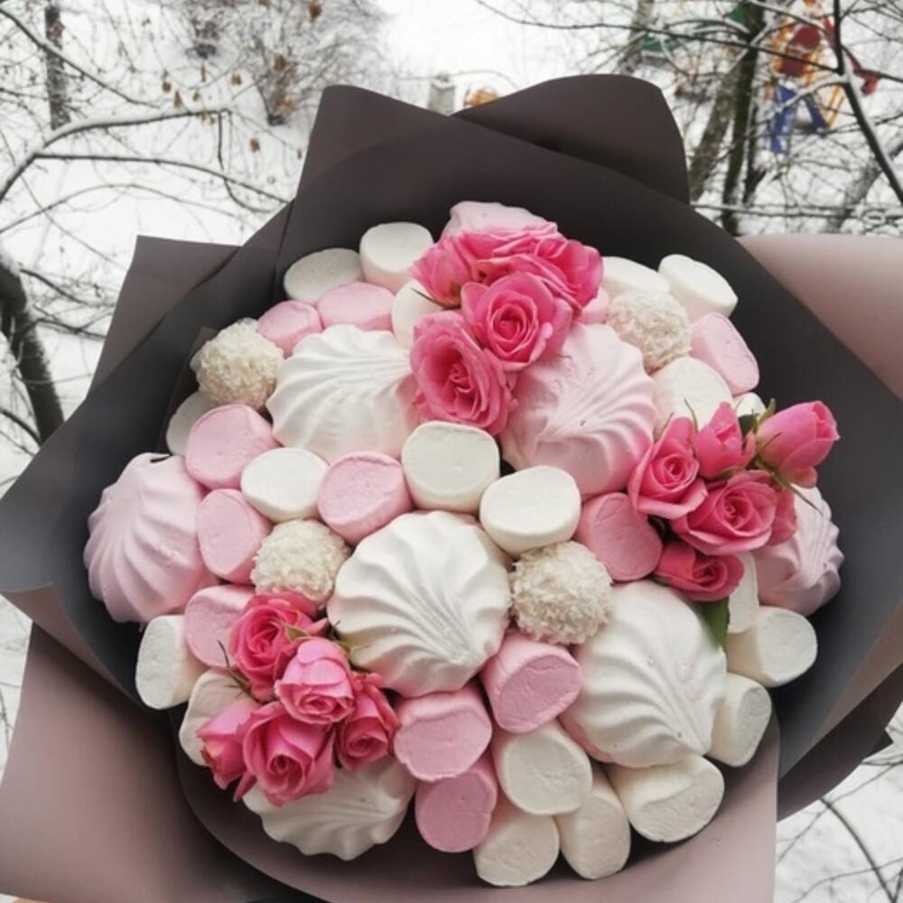 Раффаэлло – 4 шт.Зефир – 9 шт.Маршмеллоу – 250 гр.кустовые розы – 3 шт.