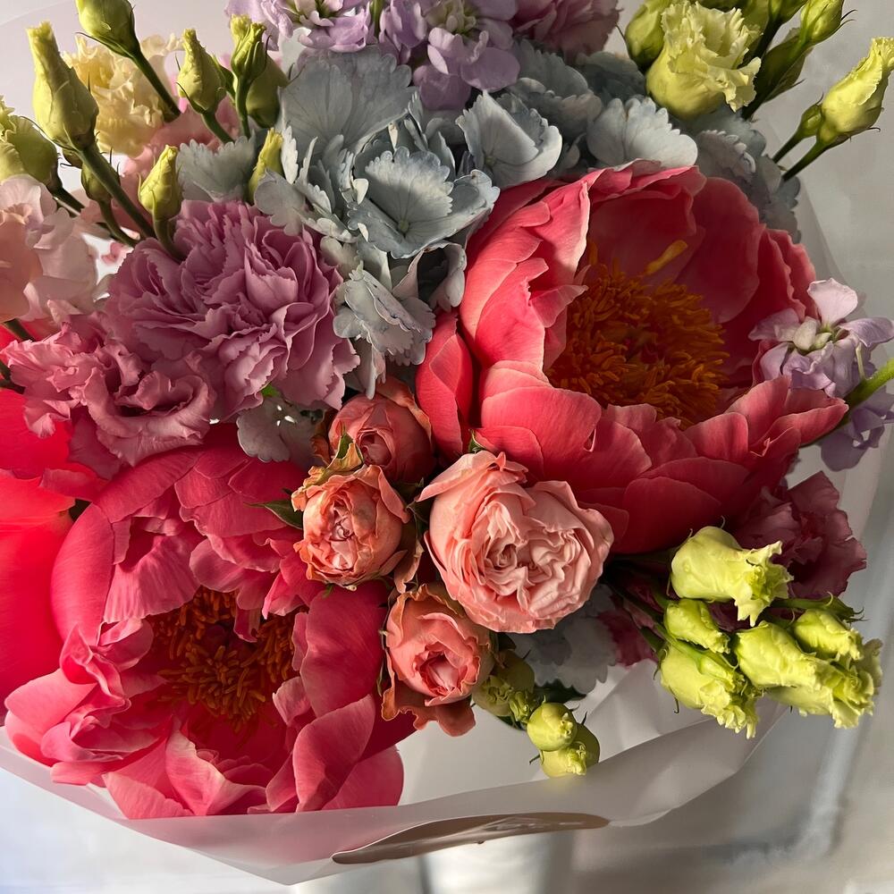 Пион – 3 шт.Гортензия – 1 шт.Маттиола – 3 шт.Роза кустовая – 1 шт.Лизиантус – 3 шт.Гвоздика – 3 шт.Упаковка дизайнерская – 1 шт.