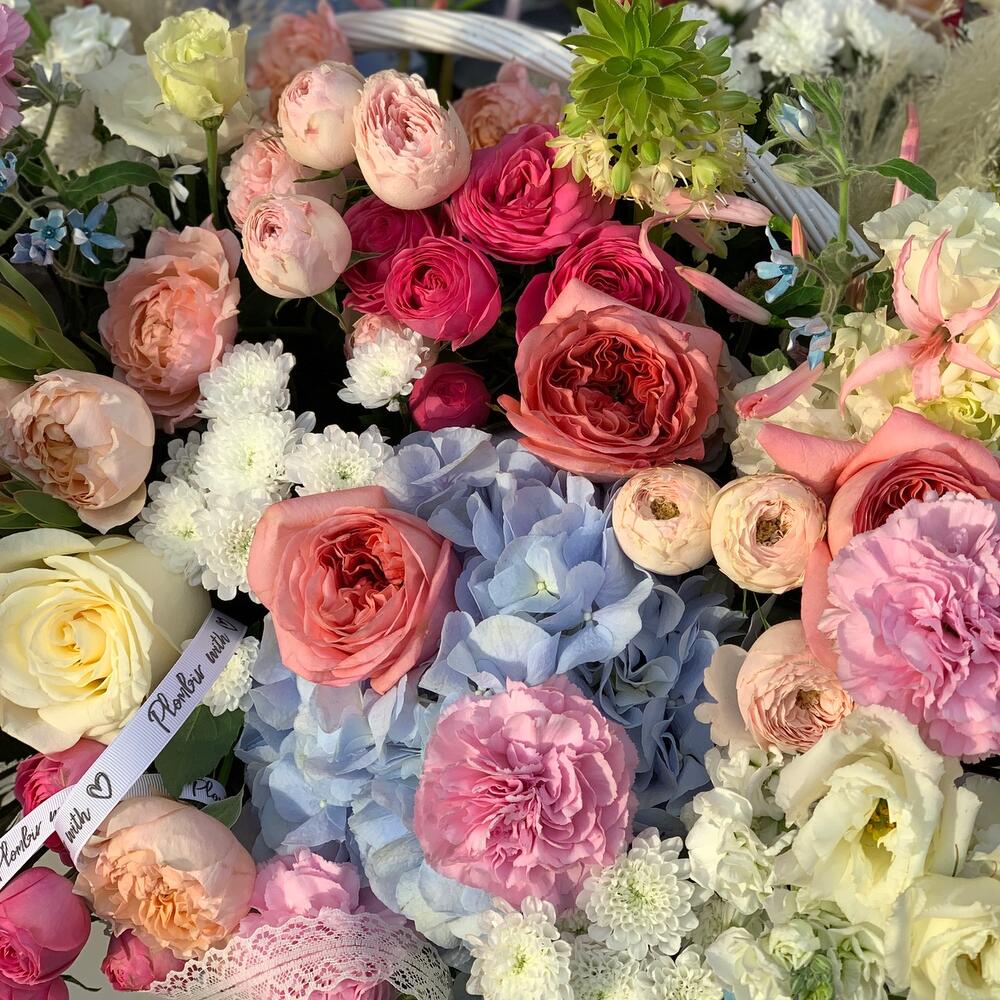 Корзина плетеная – 1 шт.менсфилд парк кустовая пионовидная – 5 шт.Сантини – 15 шт.жизель кустовая роза – 10 шт.пинк экспрешн – 10 шт.Гортензия – 2 шт.Нерина – 5 шт.джульетта кустовая роза пионовидная – 4 шт.Дельфиниум – 3 шт.Оксипеталум – 3 шт.Гвоздика – 9 шт.Сухоцветы – 4 шт.Гладиолус – 3 шт.кендилайт – 4 шт.Эустома – 8 шт.леукондендрон – 4 шт.эукомикс – 4 шт.