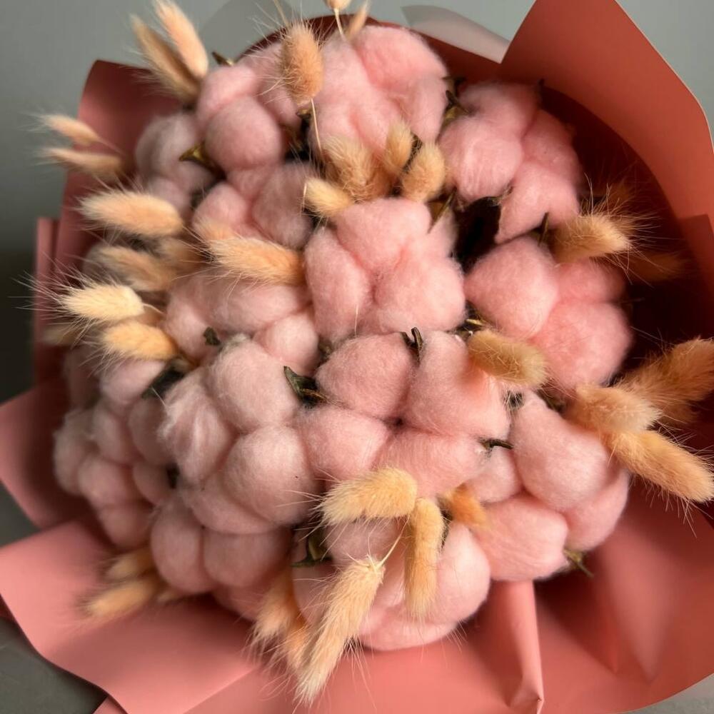 Хлопок натуральный – 15 шт.Лагурус (сухоцвет) – 40 шт.Упаковка дизайнерская – 5 шт.Лента атласная – 1 шт.