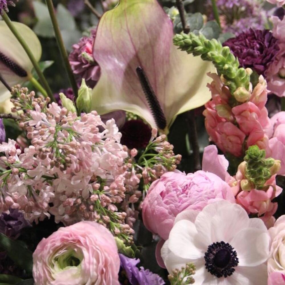 Анемон – 3 шт.Антуриум – 2 шт.Дельфиниум – 2 шт.Корзина – 1 шт.Лизиантус – 7 шт.Маттиола – 11 шт.Пион – 5 шт.Сирень – 3 шт.Хедера – 5 шт.Эвкалипт – 11 шт.Ранункулюс – 3 шт.Аллиум – 2 шт.Львиный зев – 3 шт.Тюльпан сортовой – 11 шт.Молюцелла – 2 шт.Ветви – 3 шт.