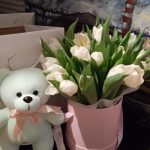 тюльпаны – 25 шт.Шляпная коробка – 1 шт.Флористическая губка – 1 шт.Мишка плюшевый – 1 шт.Пакет подарочный – 1 шт.